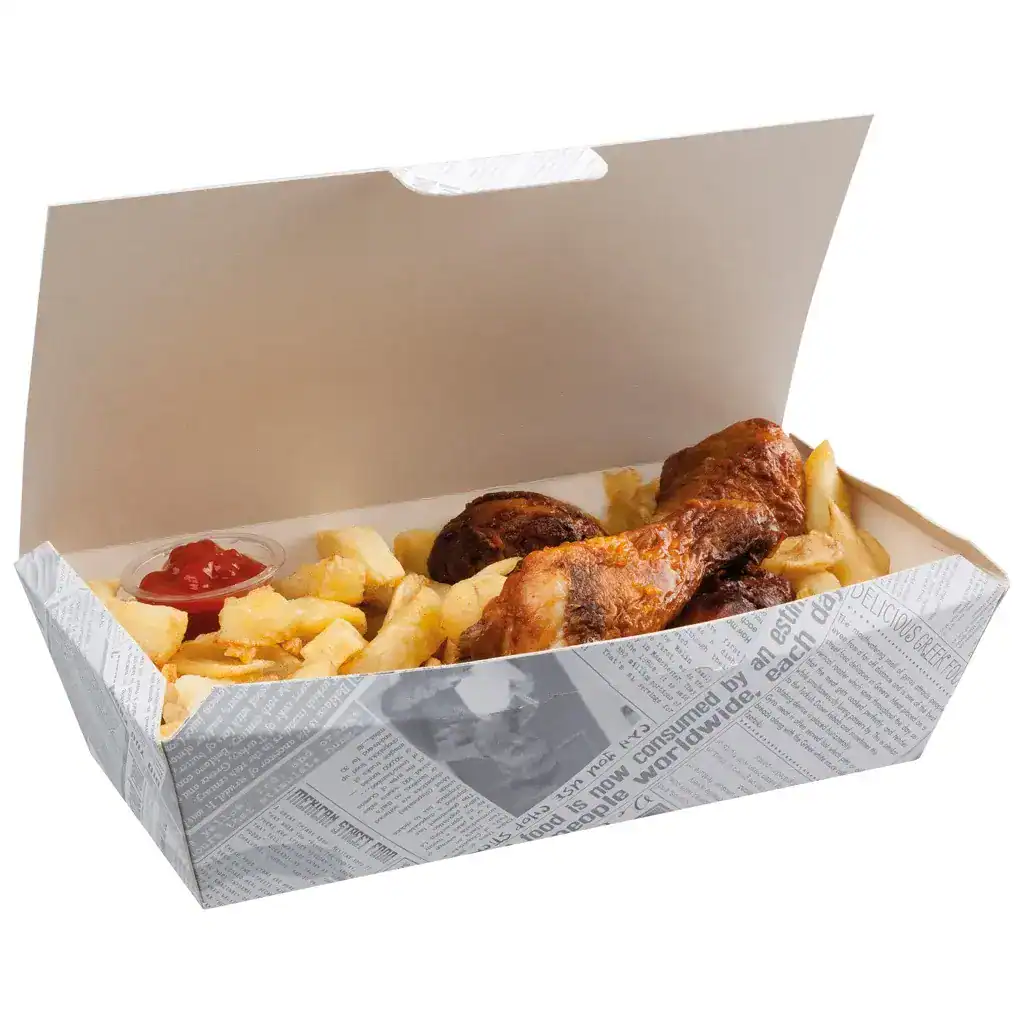 The newsprint street food box brings back that classic takeaway feel – the look of old school newspaper wrapping without the ink transfer or hygiene headaches.
