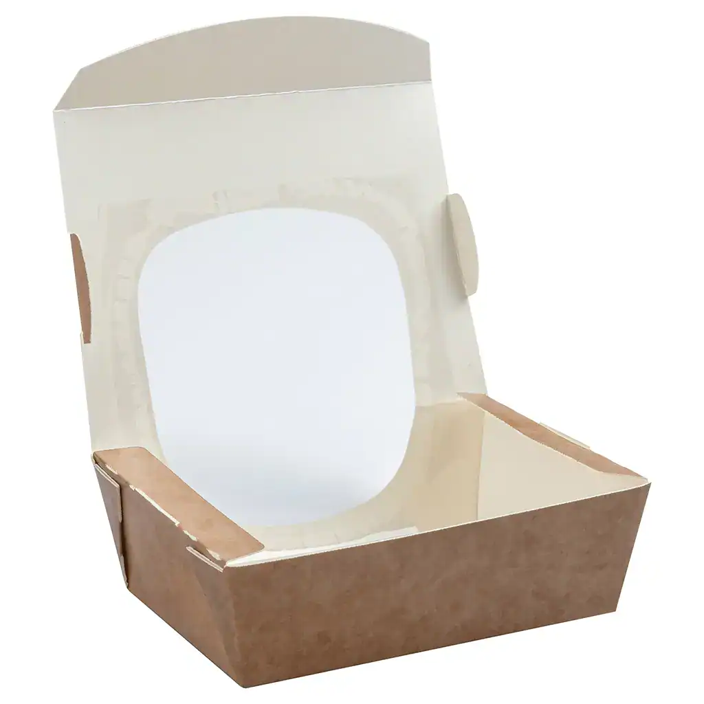Kraft print exterior, over-edged clear window with UV protection, and a push tuck closure with quick release tab – built for busy service environments.
