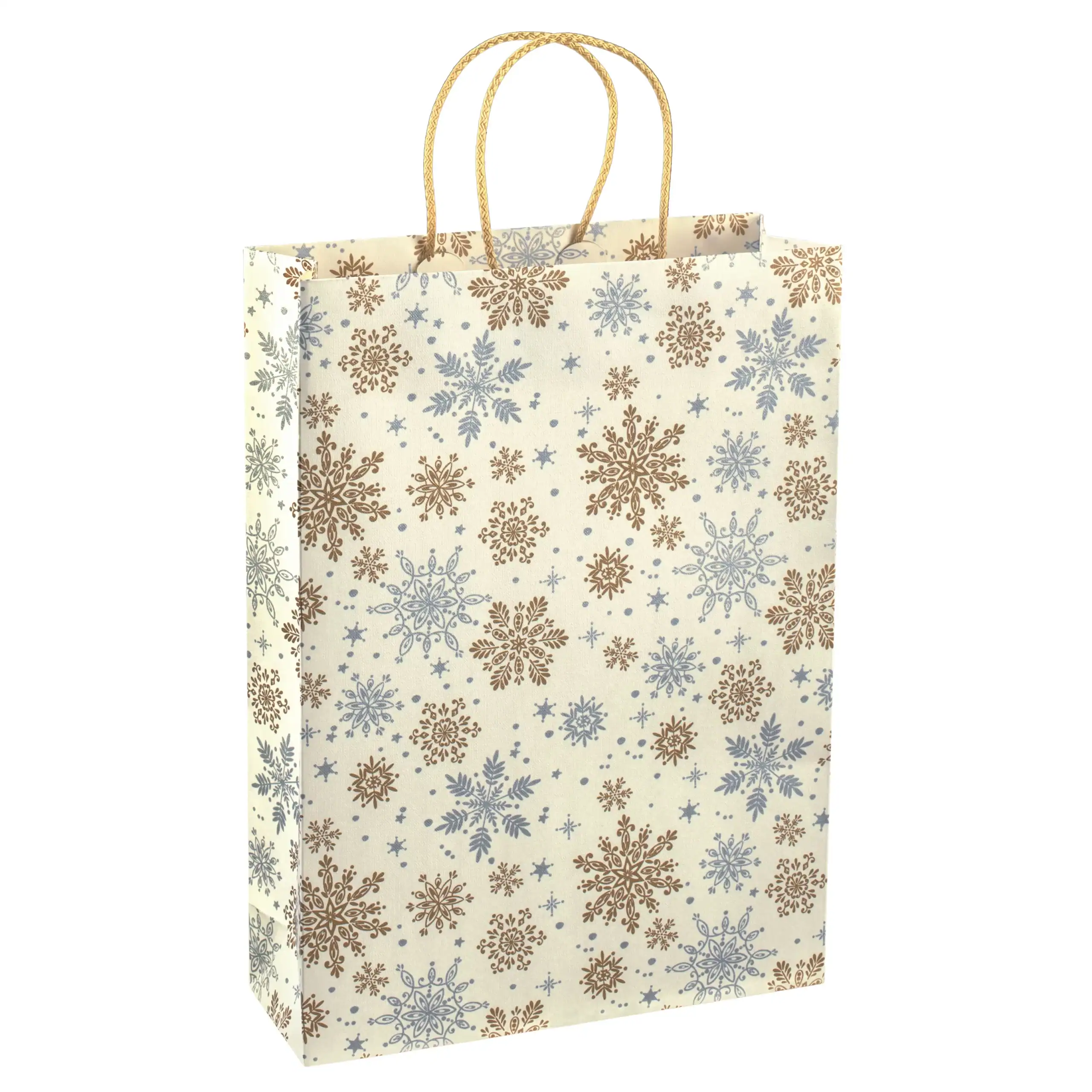 These Christmas paper gift bags with handles feature a scattered snowflake pattern in blueish silver and gold tones against a cream background. The winter design works well for general Christmas gifting without being overly themed, making them a versatile carrier bag from November all the way throughout the festive season.