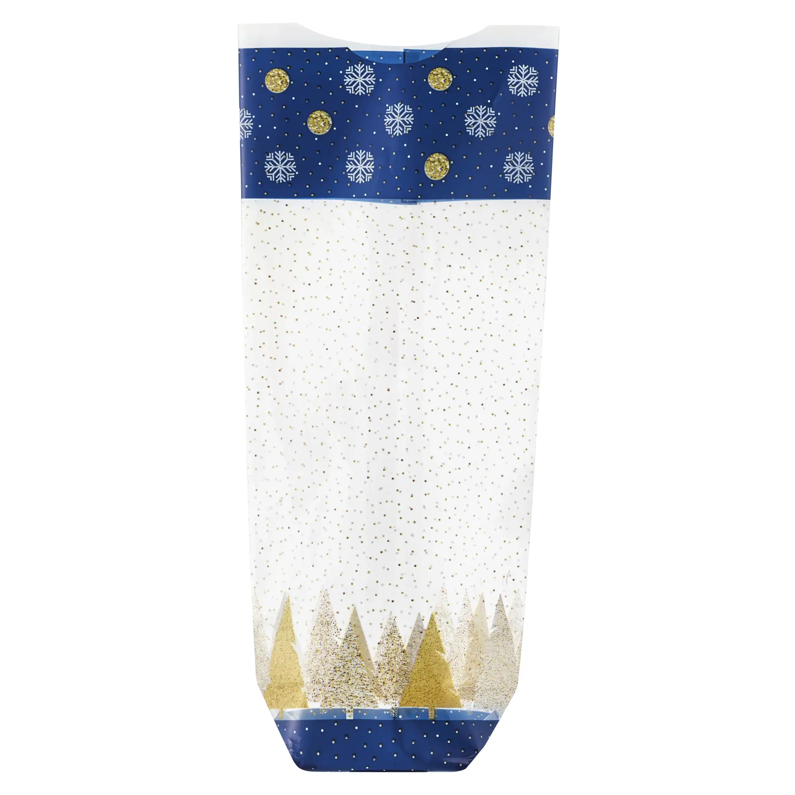 Stunning 100x220mm Christmas satchel bags showcasing an enchanting Snowy Winter Nights design with navy blue, white, and gold accents – ideal for premium festive gift packaging and upmarket retail presentations.