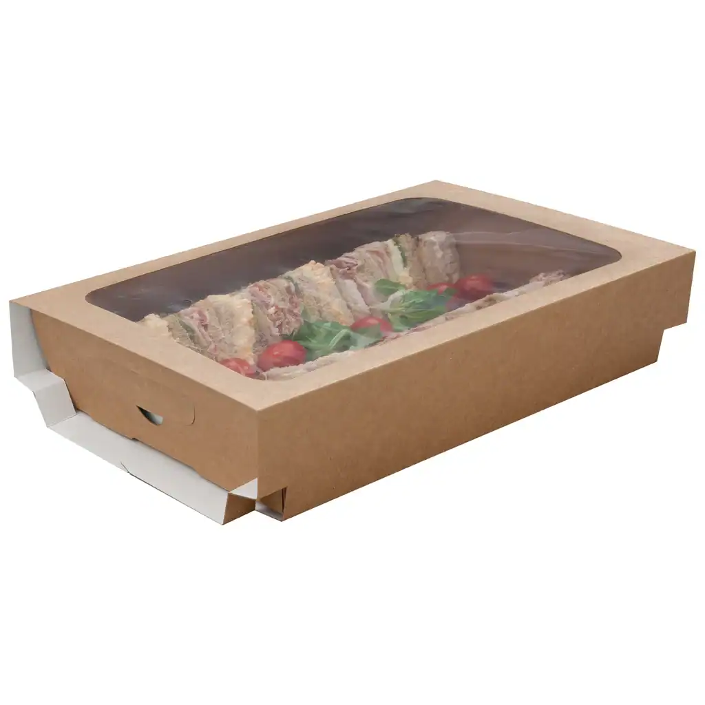 Crafted from natural kraft board, the sleeve offers a warm, organic feel while the clear compostable PLA window gives customers a tempting preview of what’s inside – whether it’s vibrant wraps, artisan sandwiches, or grazing selections.